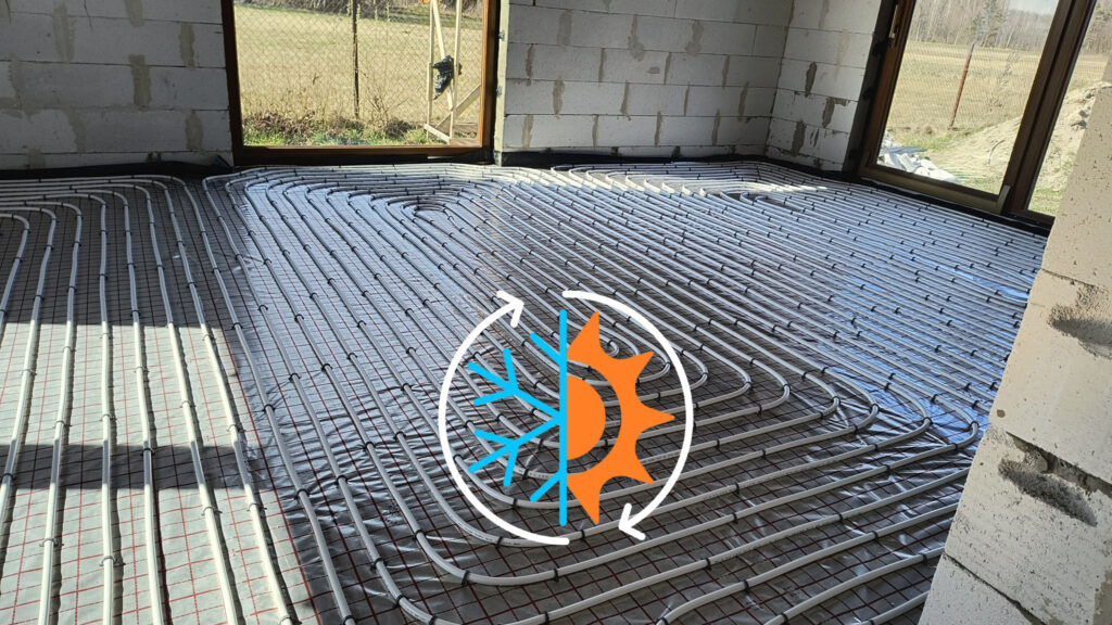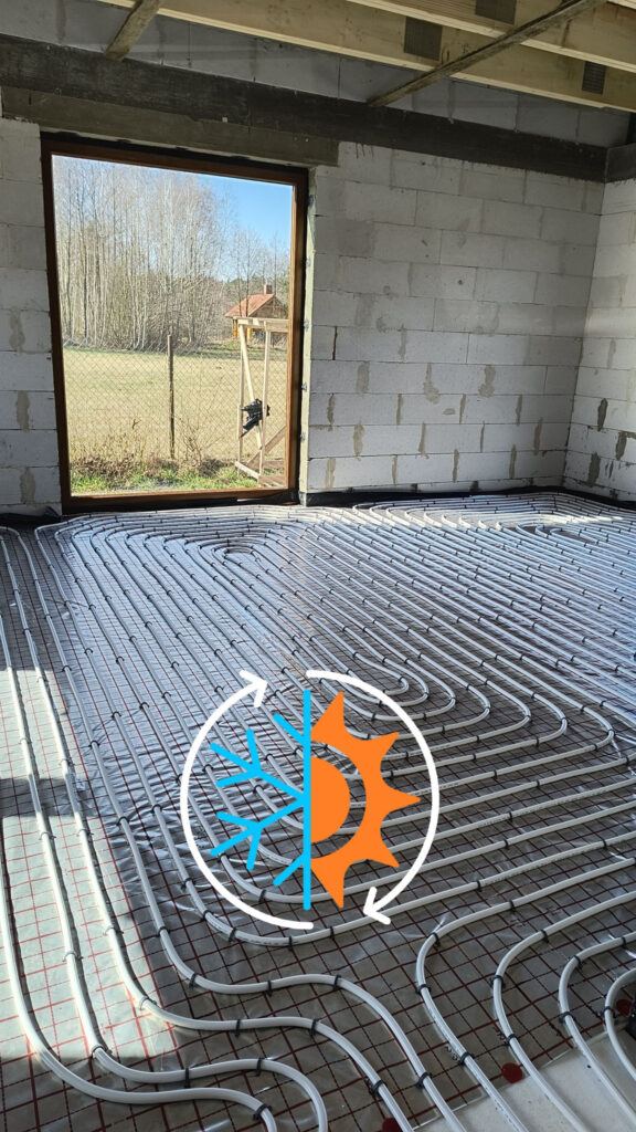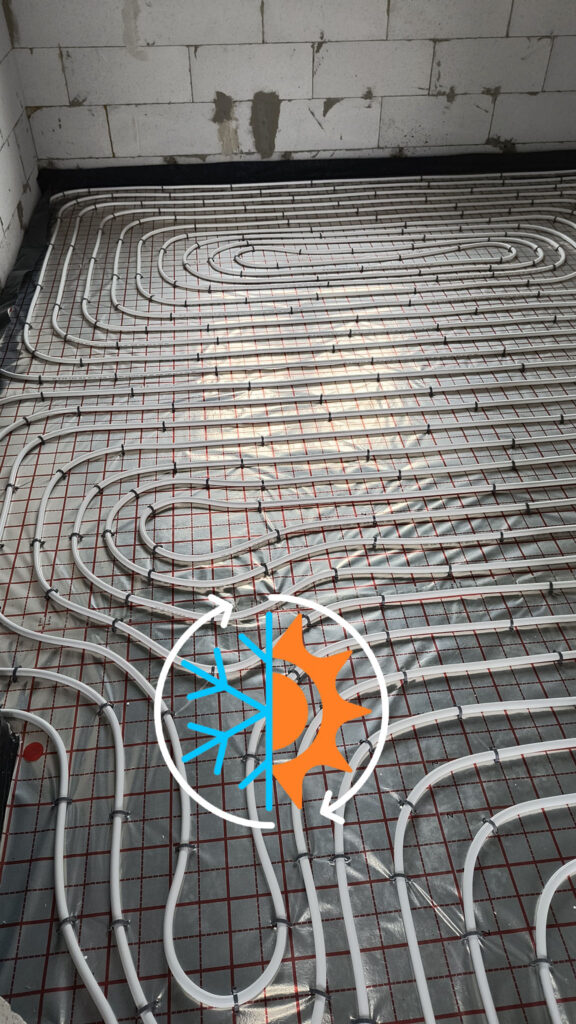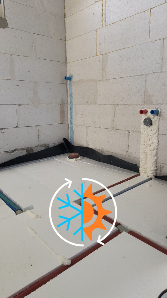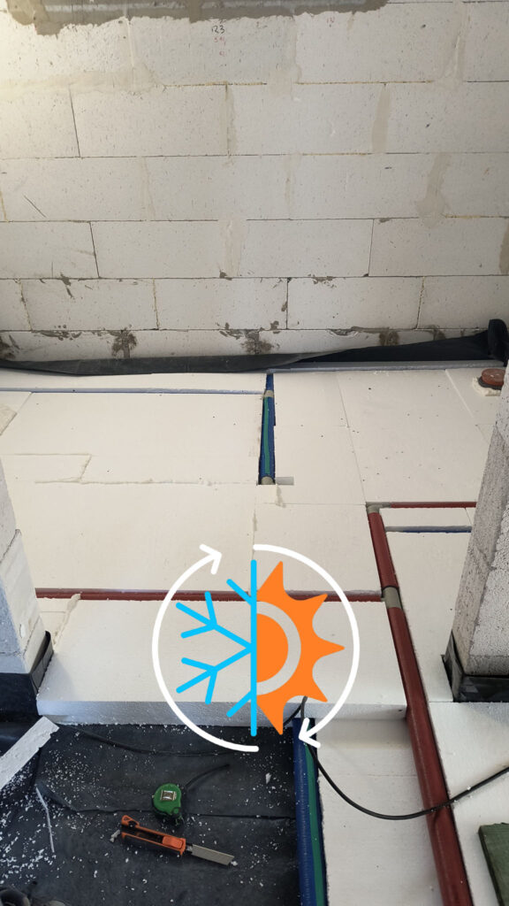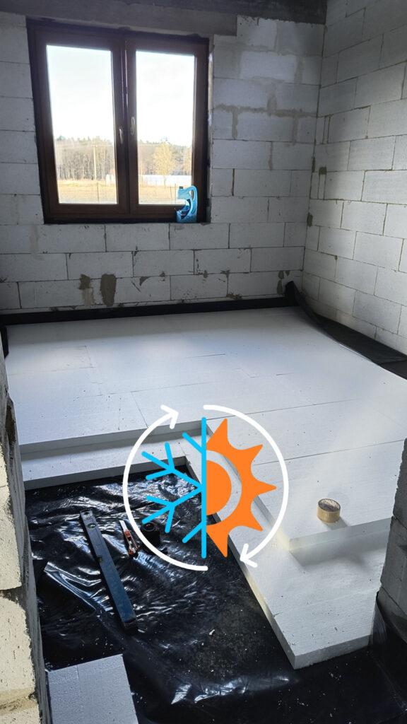 Przygotowana została izolacja podłoża z folii budowlanej 0,5mm oraz styropianu 10cm. W warstwie wierzchniej styropianu ułożone zostały linie zasilające wodę użytkową do podejść wod- kan. Dopiero po próbach szczelności instalacji można było rozpocząć układanie ogrzewania podłogowego. Zgodnie ze zleceniem klienta każde pomieszczenie posiada osobną pętlę grzewczą (lub więcej w zależności od powierzchni), a docelowo będzie także sterowane regulatorami pokojowymi zarządzającymi siłownikami w belce ogrzewania podłogowego.